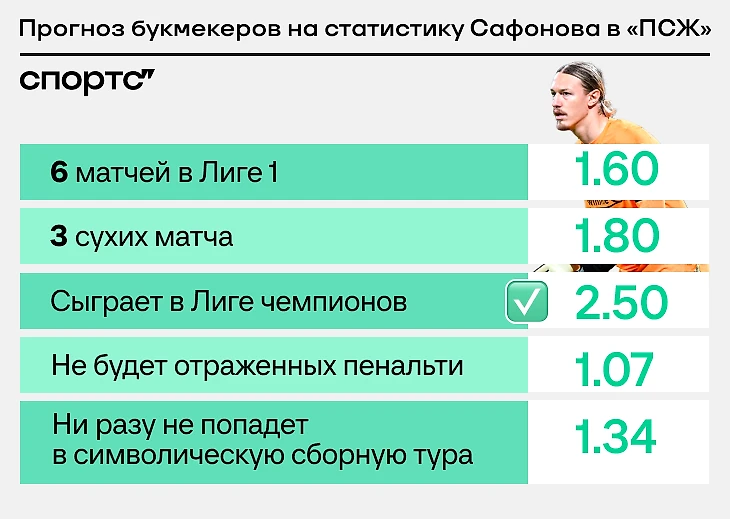 В ЛЧ Матвей уже сыграл – причем дважды. По матчам Лиги 1 в прогнозе значатся шесть, а Сафонов провел уже четыре. По сухим играм тоже близко – нужно три, а сыграно уже две.