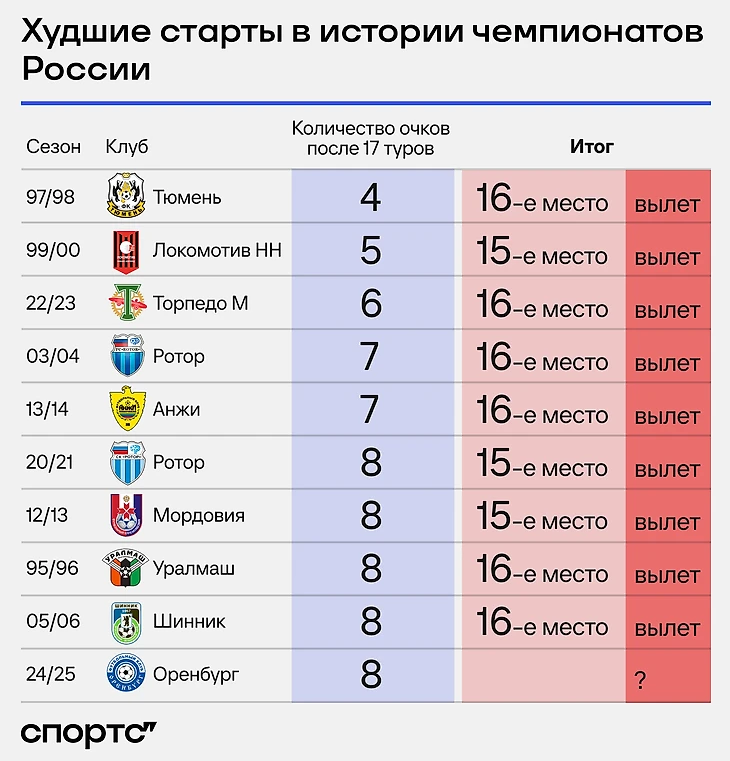За «Оренбург» сейчас говорит именно плотность в подвале. Теоретически для спасения может хватить даже 24-25 очков. То есть задача выжить реальна, несмотря на черный сигнал из истории.