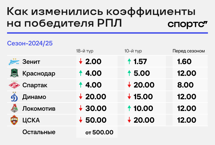 «Спартак» впечатлил всех сумасшедшей серией из шести побед подряд в РПЛ с общим счетом 19:2. Теперь на чемпионство дают 4.00, хотя только в конце октября кэф на красно-белых был 30.00!