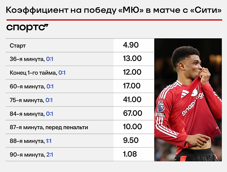 Даже при всех последних неудачах «Сити» был фаворитом перед «МЮ» – 1.62 на победу против 4.90. Йошко Гвардиол открыл счет в первом тайме, коэффициент к перерыву снизился до 1.29, а к концу игры – до 1.10.