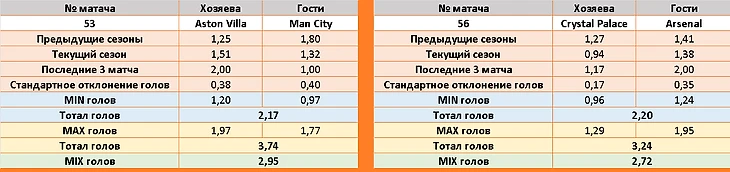 Таким образом, мы видим, что в двух матчах, по показателю средних голов мы ожидаем от 2.7 до 3.74 гола в матче АВ - Ман Сити, и от 2.2 до 3.24 гола в матче Кристал Пэлас - Арсенал.