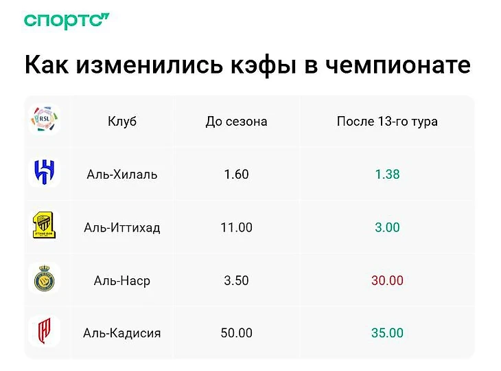 Впрочем, фаворитом у букмекеров остается уже уязвимый «Аль-Хилаль». Прошлый сезон чемпион закончил с 31 победой и тремя ничьими, поражений не было. В новом чемпионате гранд неожиданно проиграл середняку «Аль-Халиджу» и поделил очки с «Аль-Насром».