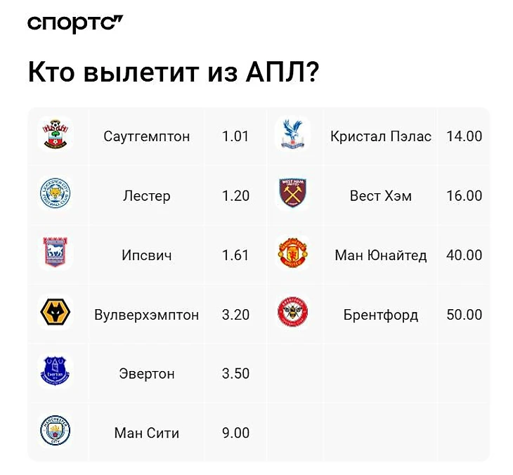 Естественно, пугает и нахождение «Манчестер Юнайтед» в линии на понижение в классе. Здесь после ничьей на «Энфилде» – прогресс. Коэффициент на вылет «дьяволов» повысился с 14.00 до 40.00. В то же время «МЮ» – девятый кандидат на понижение, а это ведь еще с учетом потенциального штрафа «Манчестер Сити». Интересно, что коэффициент для «Брентфорда» выше.
