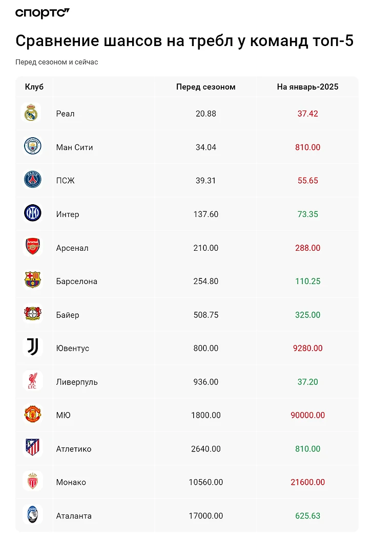 ● В этом списке не хватает «Баварии» – из-за вылета из Кубка Германии от «Байера» еще в начале декабря. А коэффициент на требл был бы невелик. Например, на старте сезона на победу в Кубке давали 2.40, сейчас на чемпионство – 1.15, а на успех в ЛЧ – 9.00. И тогда все вместе вышло бы 24.84 – то есть даже меньше чем у «Ливерпуля» и «Реала». И 4% на успех.