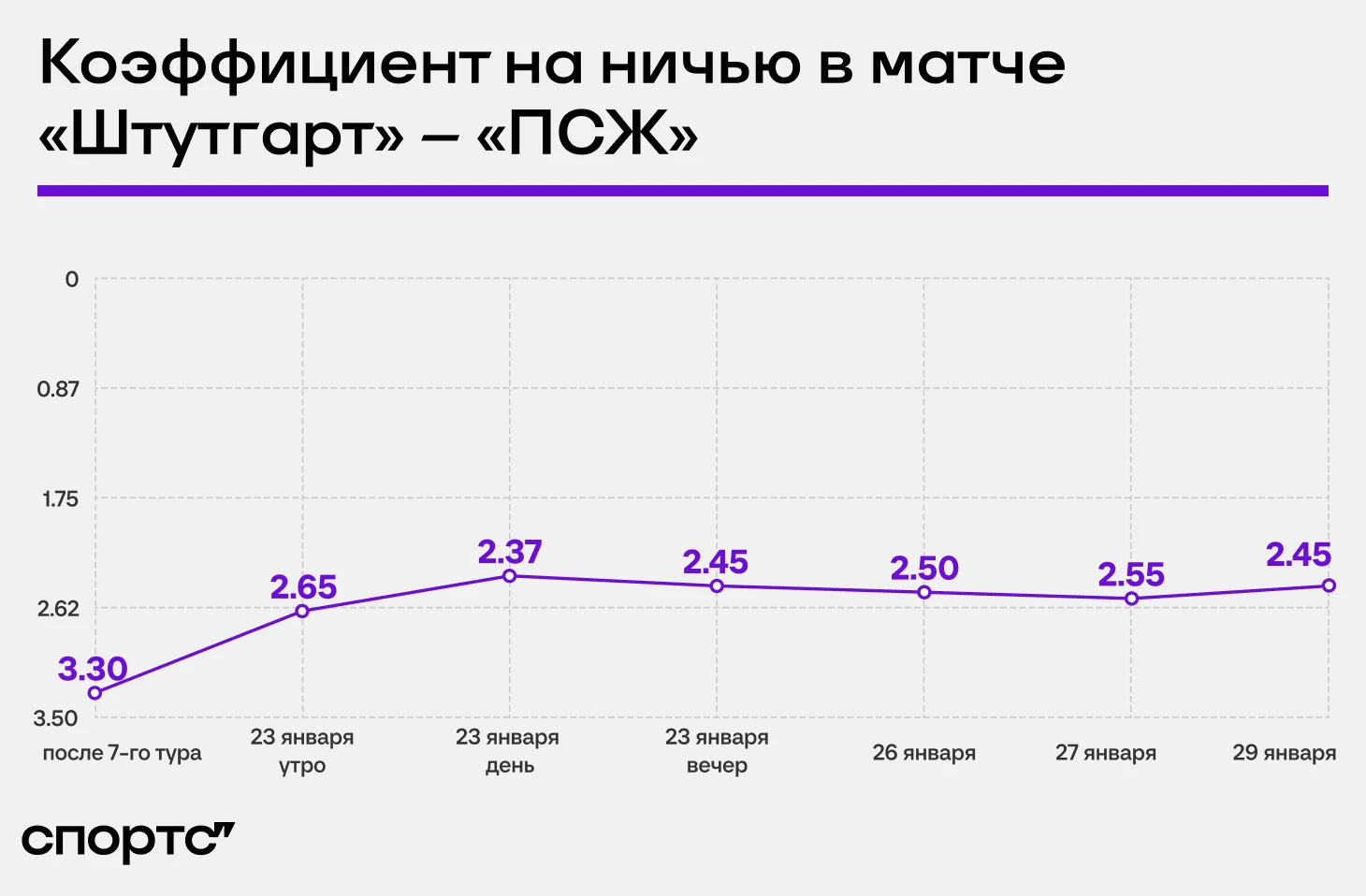 Линия на матч «Штутгарт» – «ПСЖ» открылась сразу после седьмого тура. Изначально на ничью давали 3.30, но кэф повалился буквально за ночь, а на следующий день упал до 2.37.
