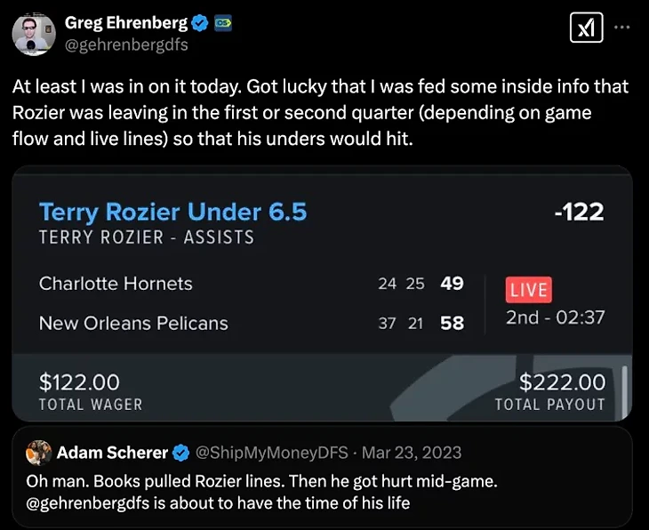 ● 23 марта 2023-го «Шарлотт» принимал «Новый Орлеан». Перед игрой беттинг-компании засекли нетипичный всплеск ставок на статистику Розира. Позже некоторые букмекеры вообще сняли его индивидуальные показатели с линии.