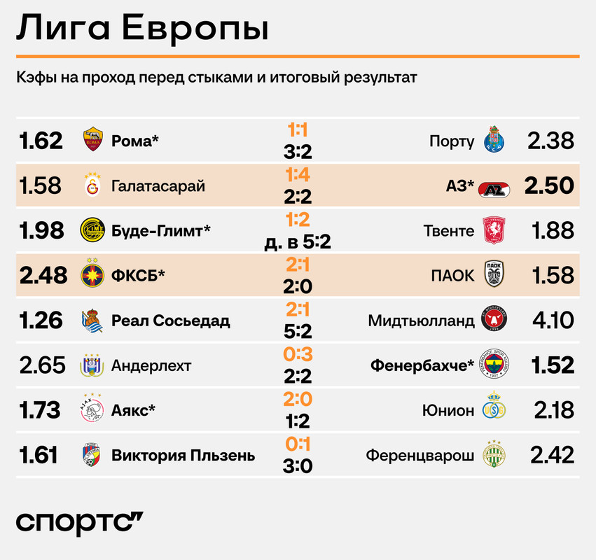 В Лиге Европы и Лиге конференций завершился стыковой раунд. Многие вывески на первый взгляд не обещали огня, но получилось жарко, а небольшие сюрпризы добавили остроты. Разбираемся, кто из фаворитов не дожил до 1/8 финала.