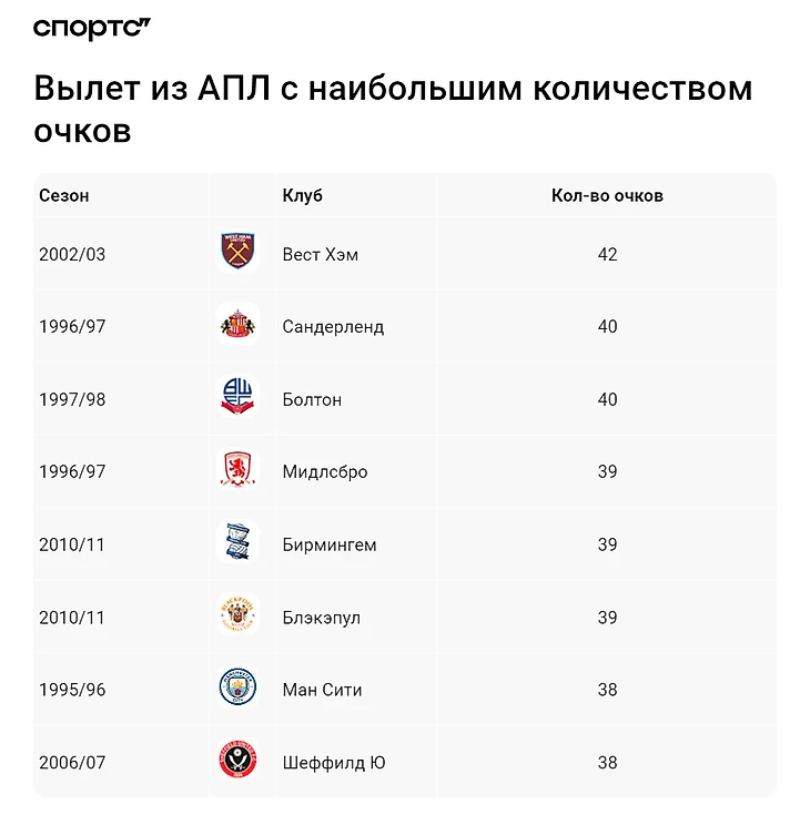 Самая большая неудача – вылет в 2003-м «Вест Хэма» с 42 очками. Здесь же – удивительное. После 27 туров команда шла предпоследней, отставая на пять очков от спасительного 17-го места. За следующие 11 туров «Вест Хэм» набрал 22 очка – только у двух команд за отрезок было больше! Но даже такой мощный рывок не помог спастись, не хватило двух баллов.
