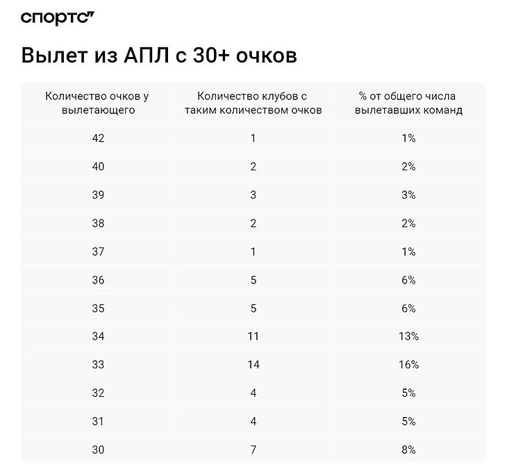 За предыдущие 29 сезонов при нынешнем календаре АПЛ всего 87 команд покидали элиту. Две трети – 59 из них – набирали не менее 30 очков.