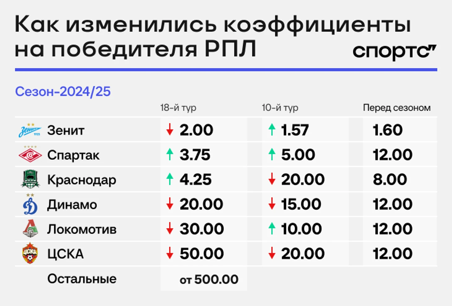 В прошлом сезоне к возобновлению РПЛ «Краснодар» опережал «Зенит» на два очка, дальнейшее отставание от лидера у команд было в шесть, семь и восемь очков. Так что и расклады по коэффициентам были другими: 1.53 на «Зенит», 3.10 на «Краснодар», а дальше – от 25.00.