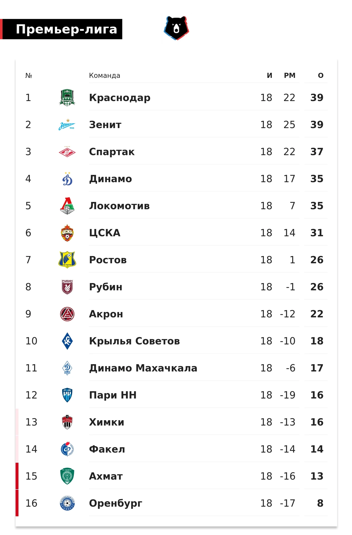 Как выглядит таблица после 18 туров: лидируют «Краснодар» и «Зенит», в двух очках – «Спартак», рядом «Динамо» и «Локомотив». По сути, в чемпионской гонке – сразу пять команд. При определенных раскладах внедриться в нее сможет и ЦСКА.