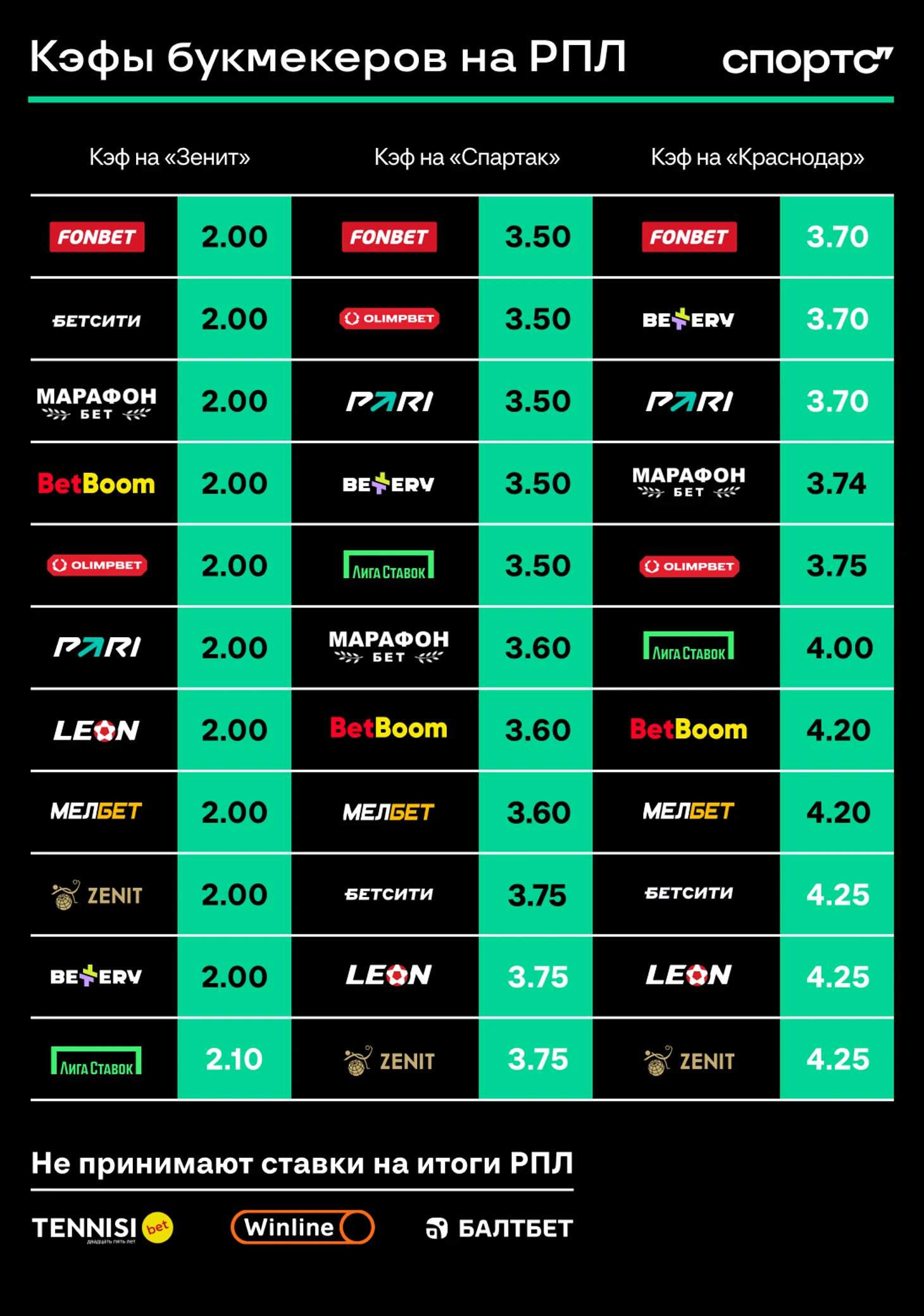 Любопытно, что «Бетсити», БК «Зенит» и «Леон» отличились по коэффициентам на «Спартак». Только три букмекера пока дают 3.75 на титул красно-белых, несмотря на мощные трансферы и идеальную серию в чемпионате до зимней паузы.