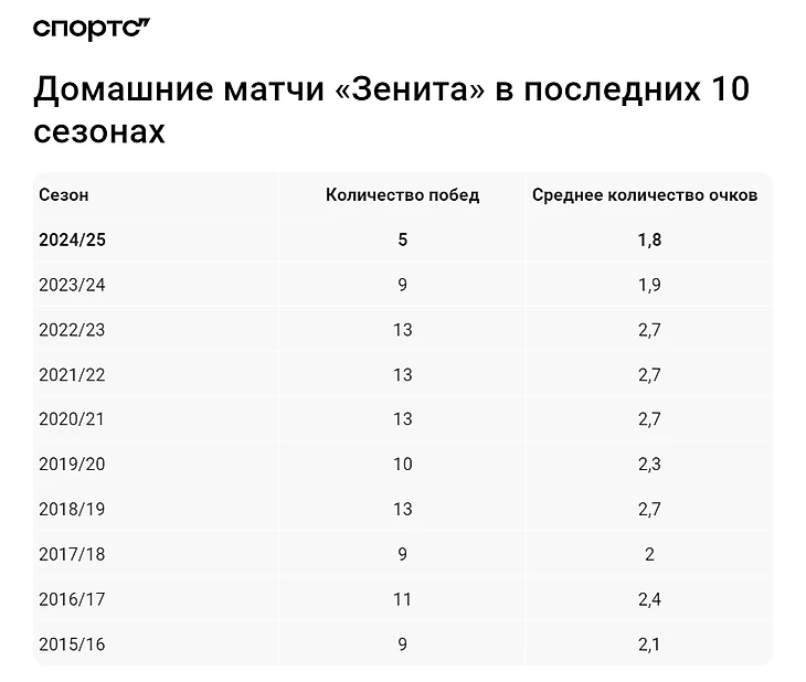 Что-то пошло не так еще в прошлом сезоне. Тогда «Зенит» по игре дома тоже был шестым, количество очков сократилось, побед стало меньше. Получается, за предыдущие 25 домашних матчей «Зенит» выиграл всего на игру больше, чем за 15 на своем поле в сезоне-2022/23.