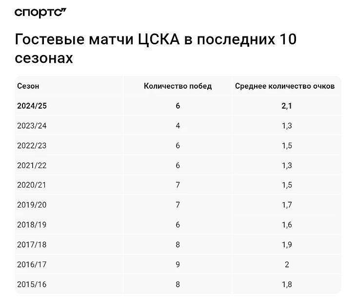 Ориентироваться следует на сезон-2016/17 – сильнейший гостевой для ЦСКА за последние десять лет. Тогда удалось набрать даже больше очков, чем чемпиону «Спартаку», при этом не забивая много – всего 16 голов за 15 игр. Для сравнения: сейчас у ЦСКА 13 мячей, а впереди еще пять гостевых матчей.