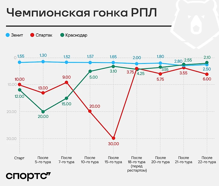 В обновленной линии букмекеры глобально не изменили расклад по шансам у двух фаворитов. «Краснодар» приближается к 50% (2.10), действующий чемпион стоит чуть ниже (2.50). Аналитики по-прежнему предполагают, что «Спартак» не будет претендовать на титул. Коэффициент на красно-белых упал до 6.00. Точно не приговор. По ходу этого безумного сезона было и 30.00.