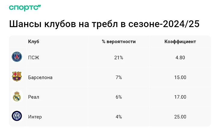 В Европе выделяются четыре команды с возможным треблом по итогам сезона: это «ПСЖ», «Барселона», «Реал» и «Интер». Шансы французов видят выше, чем у других клубов.