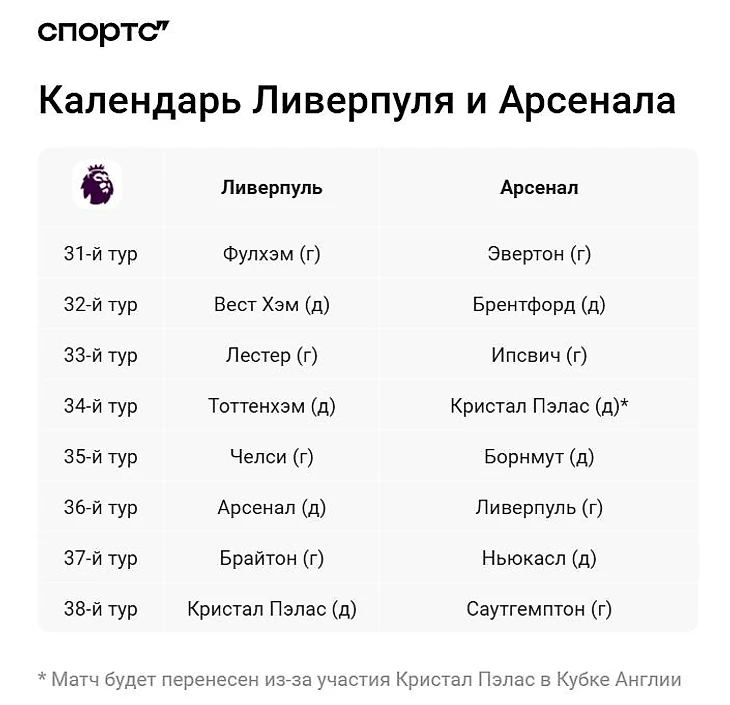 И еще одна сноска касается матча «Арсенала» с «Кристал Пэлас» в 34-м туре: игру точно сдвинут с 26 апреля, соперник вышел в полуфинал Кубка Англии. Вероятно, проведут 23 апреля, но дату пока не подтвердили.