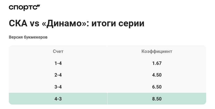 Перед плей-офф на проход СКА давали кэф 2.00, на «Динамо» – 1.81. То есть фаворит читался, но по сути разница была минимальная. Если вспоминать регулярку, то петербуржцев даже слегка переоценили.