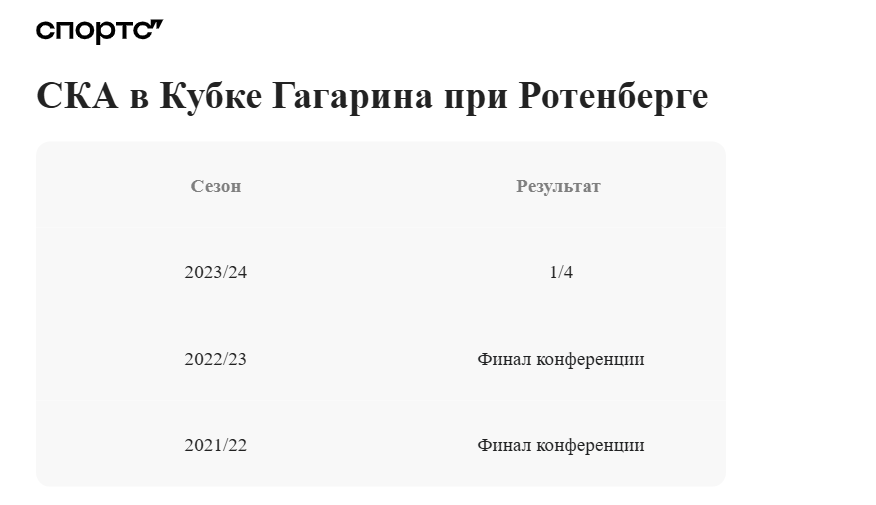 Перед плей-офф же СКА выпал из топ-5, а четвертая попытка Ротенберга завоевать Кубок Гагарина рискует стать самой худшей. При нем петербуржцы дважды добирались до полуфинала, а в прошлом сезоне сенсационно вылетели во втором раунде от «Автомобилиста».
