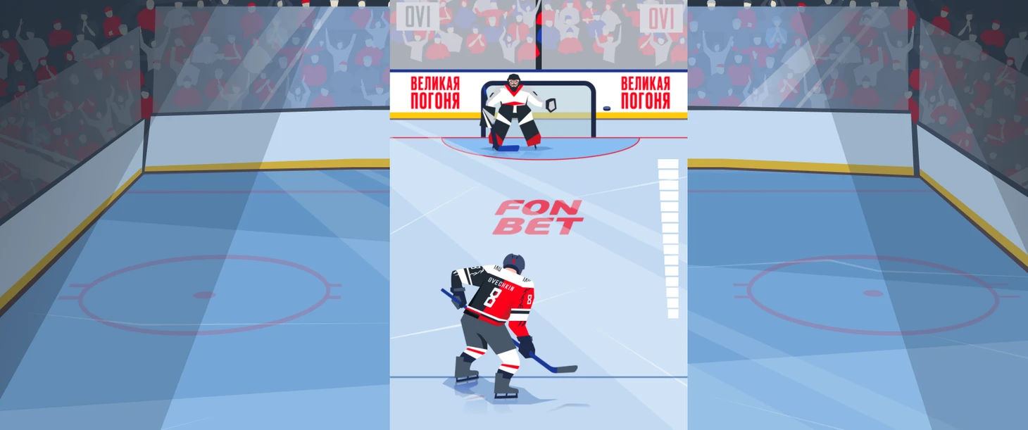 «Фонбет» разработал игру прямо на сайте. Нужно попасть в ворота прямым ударом по шайбе в зависимости от расположения вратаря. Можно регулировать силу удара и расположение хоккеиста.