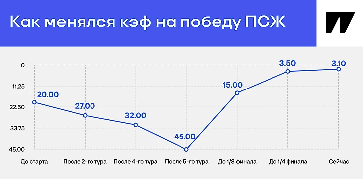 Декабрь в Лиге чемпионов «ПСЖ» встречал на 25-м месте, с разницей мячей -3. Именно тогда букмекеры вообще вычеркнули парижан из претендентов. Куда интереснее линии на невыход в плей-офф. Букмекеры давали 2.30 на то, что финишируют вне топ-24, а аналитики Opta повышали вероятность до 45%. Коэффициент на титул улетел к 45.00.