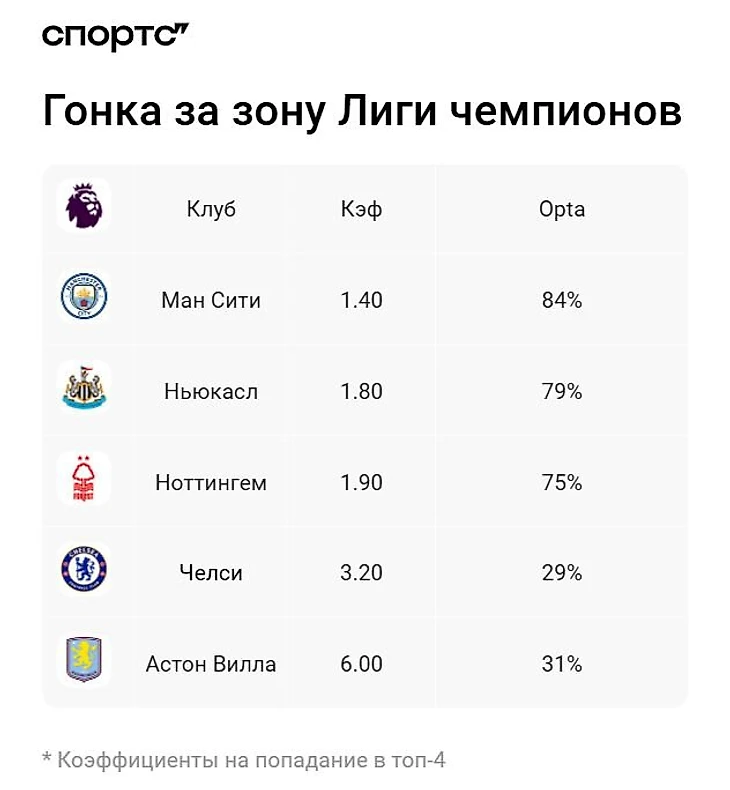 «Ман Сити», «Ньюкасл» и «Ноттингем» – главные фавориты на топ-5. Показательно, что Opta уже ставит «Виллу» выше «Челси». Обратите внимание на проценты в таблице.