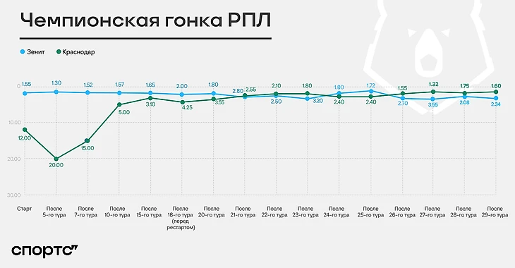 Перед 29-м туром расстояние сократилось до одного очка, «Краснодару» отдавали 57% вероятности чемпионства, «Зениту» – 48% (больше 100% в сумме – из-за маржи букмекеров).