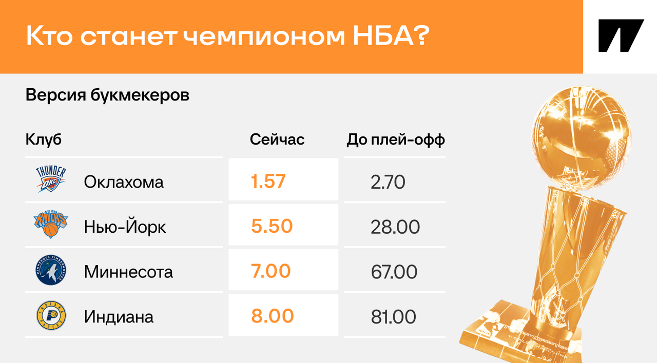 Чемпионство любой другой команды будет сенсаций. Кэф на каждую упал минимум в пять раз со старта плей-офф, но даже так они и не близко к «Тандер».