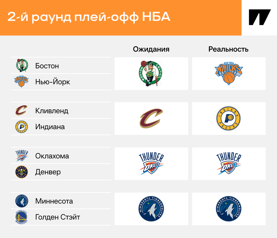 В НБА определились финалисты конференций. На Западе «Оклахома» сойдется с «»Миннесотой», а на Востоке неожиданная пара: «Индиана» и «Нью-Йорк» Ну кто ожидал, что они пройдут «Бостон» и «Кливленд»?