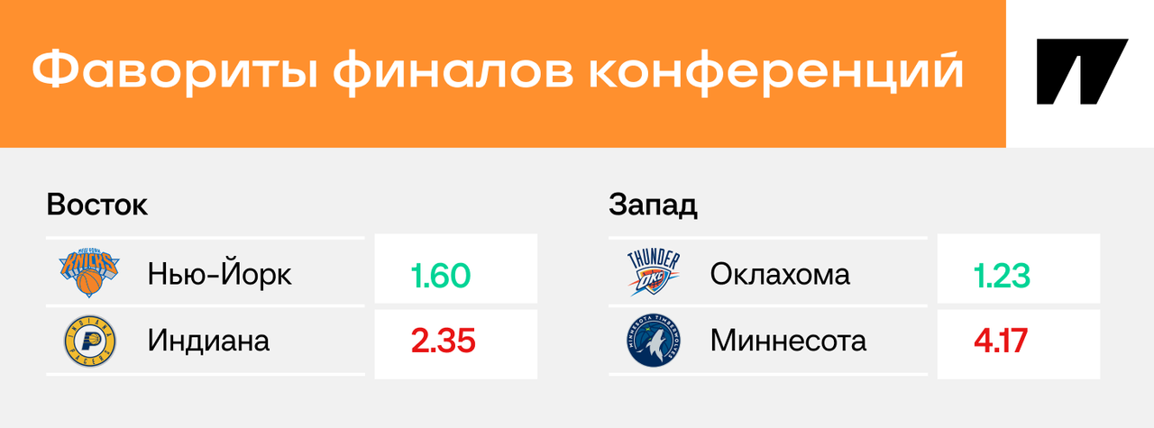 В этом плей-офф нет равных по котировкам пар. Финалы конференций не стали исключением. На Западе «Оклахома» идет суперфаворитом против «Миннесоты», и даже в неожиданной паре на Востоке выделяется явный лидер.