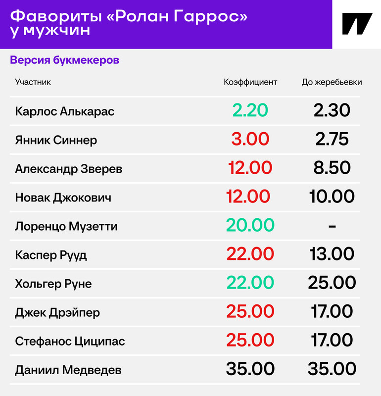 До жеребьевки остальные были далеко от этих двоих, а теперь еще дальше. Ближайшие: Новак Джокович и Александр Зверев, на них дают по 12.00. Это целая пропасть по сравнению с кэфами на главных фаворитов. Серб в 2023-м взял третий (и последний?) титул «Ролан Гаррос», а немец – прошлогодний финалист.