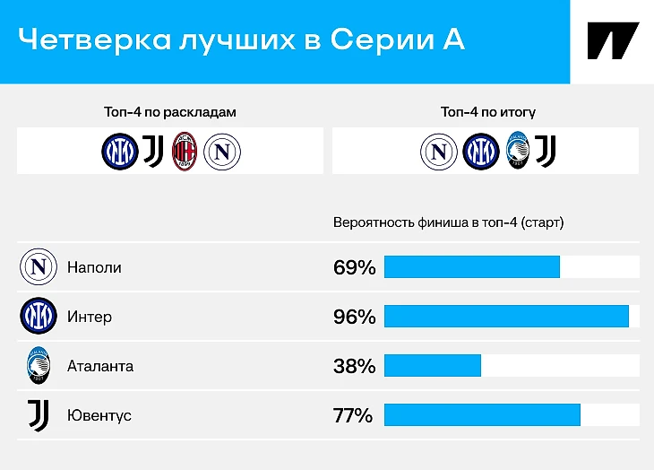 Сезон всех расставил. Например, за десять туров до конца «Аталанта» обеспечила место в четверке на 98%, а попадание «Милана» туда примерно в то же время оценивалось всего в 1,5% – это вместо 71% в начале.