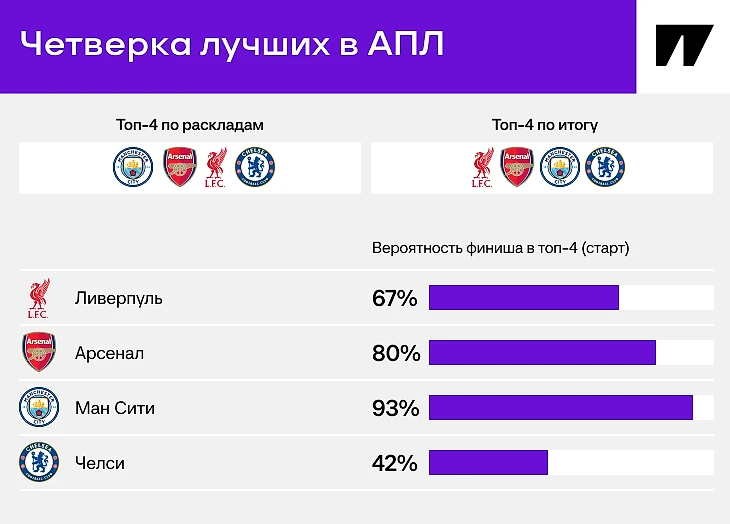 Вероятность на «Челси» стартовала с 42%, а в 15-м туре даже взлетела до 89%, но дальше пошли неудачи, так что за тур до конца было даже 29%. И все-таки финишировали в четверке.