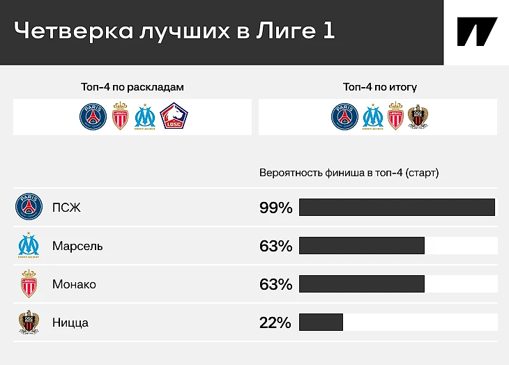 Топ-4 Лиги 1: угадано 3/4, но мог проскочить клуб с 6%