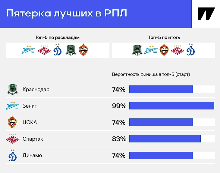● РПЛ (топ-5): «Зенит», «Спартак», «Краснодар», ЦСКА, «Динамо» М.