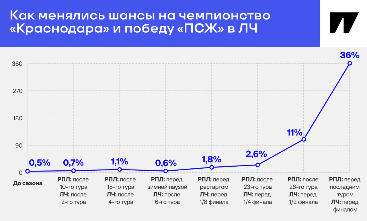 К марту кэфы не особо сдвинулись. «Краснодар» зимой никого не купил, при этом конкуренты прилично усилились – как тут бороться за чемпионство? А «ПСЖ» попал на «Ливерпуль» в 1/8 финала, все шло к очередному вылету. Но наступил апрель, а оба клуба были в игре. В начале мая все перевернулось: впервые за сезон вероятность обоюдного успеха превысила 10%.