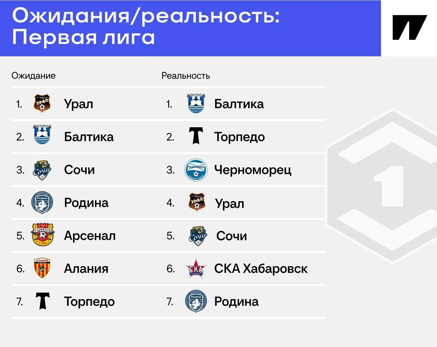 Еще два клуба заняли не вполне ожидаемые позиции. «Тюмень» котировали 12-й, а в итоге – последнее место: слишком много очков было упущено по осени. Напротив, «Ротор» оценивали 15-м, а получилось финишировать девятым.