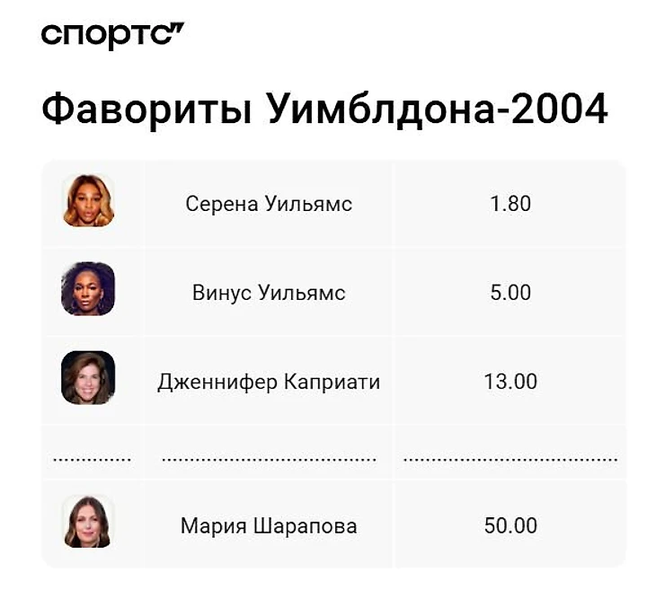 Естественно, не ждали чуда и от Марии Шараповой на «Уимблдоне» в том же году. Тогда предсказывали доминирование сестер Уильямс. Вероятность победы Шараповой не превышала 2%.