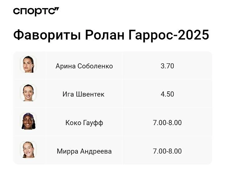 ● На Андрееву много ставили с высокими коэффициентами. На сайте Oddschecker Андреева попала в топ популярных вариантов во всех видах спорта – эффект двух трофеев. В итоге коэффициент на победу в Париже там рухнул до 9.00. Еще в феврале Мирра не входила даже в топ-5, уступая, например, Елене Рыбакиной.