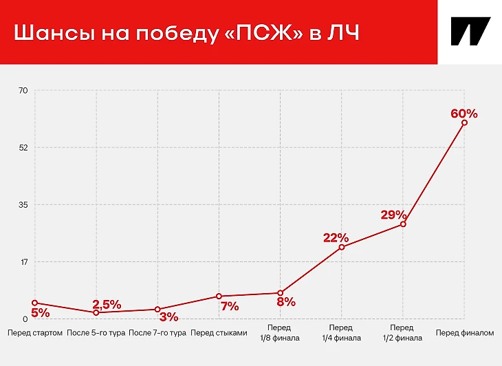 «ПСЖ» шел восьмым среди претендентов на победу в ЛЧ, стартуя всего с 5%. Основной этап складывался тяжело, так что шансы на итоговый успех рушились даже до 2,5% после пятого тура.