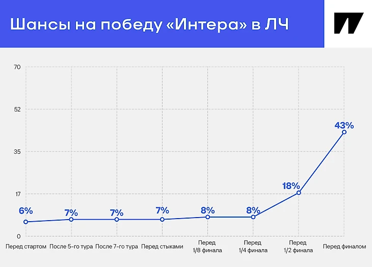 Перед стыками было 7%, перед 1/8 финала – 8%, но победа над «Ливерпулем» все изменила: в четвертьфинале стало 22%, а к финалу шансы возросли до 60%.
