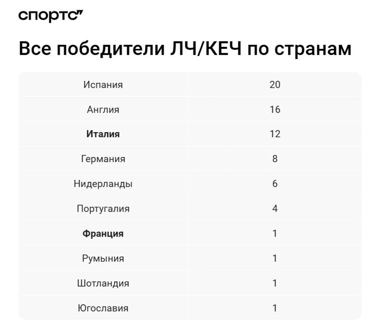 Если «ПСЖ» победит, то Франция хотя бы выйдет на чистое седьмое место по количеству трофеев. Пока по одному титулу также есть у Шотландии, Румынии и Югославии. Естественно, с учетом побед в Кубке европейских чемпионов.