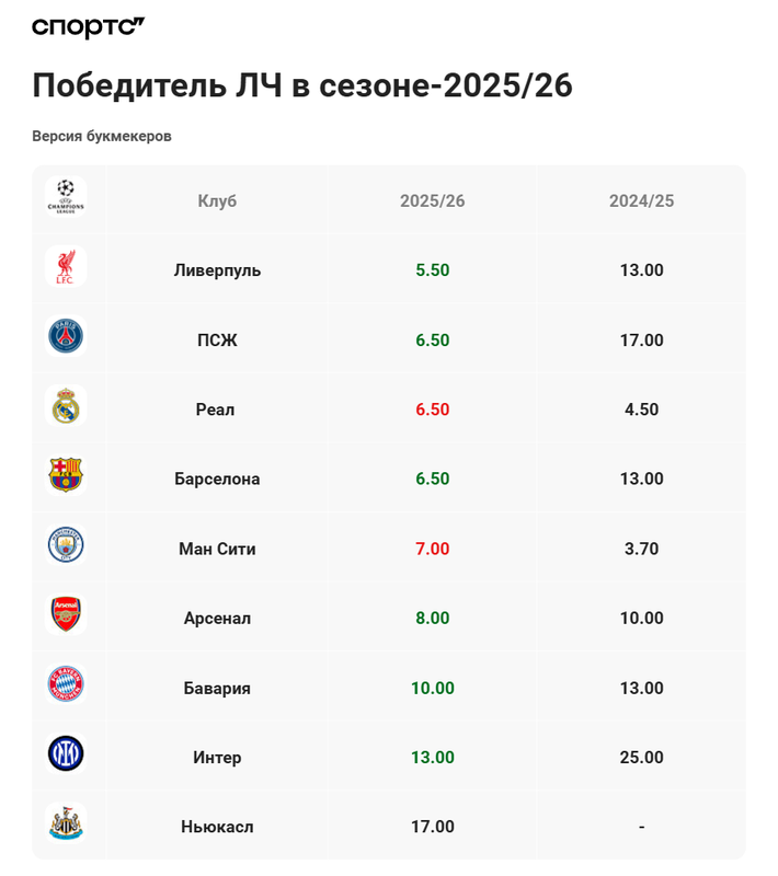 Возглавляет список «Ливерпуль», хотя клуб пару месяцев назад вылетел в 1/8 финала от «ПСЖ». Это мини-сенсация: мерсисайдцы идут фаворитами впервые с 2009 года, когда начали системно фиксировать предсезонные коэффициенты на победу в ЛЧ.