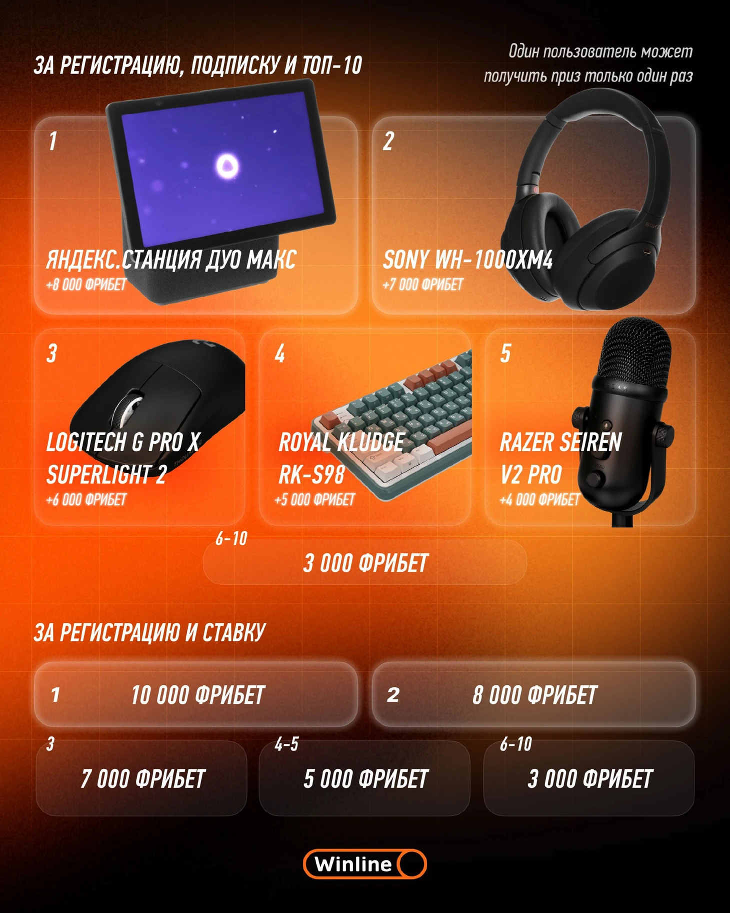 Если ты зарегистрирован в Winline, подписан на канал Winline и попал в топ-10, то мы гарантированно наградим тебя призами: