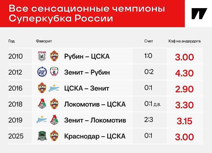 Суперкубок России разыгрывается с 2003-го. Турнир долгое время выигрывали строго фавориты. Суммарно доматчевые аутсайдеры теперь оформили шесть побед.