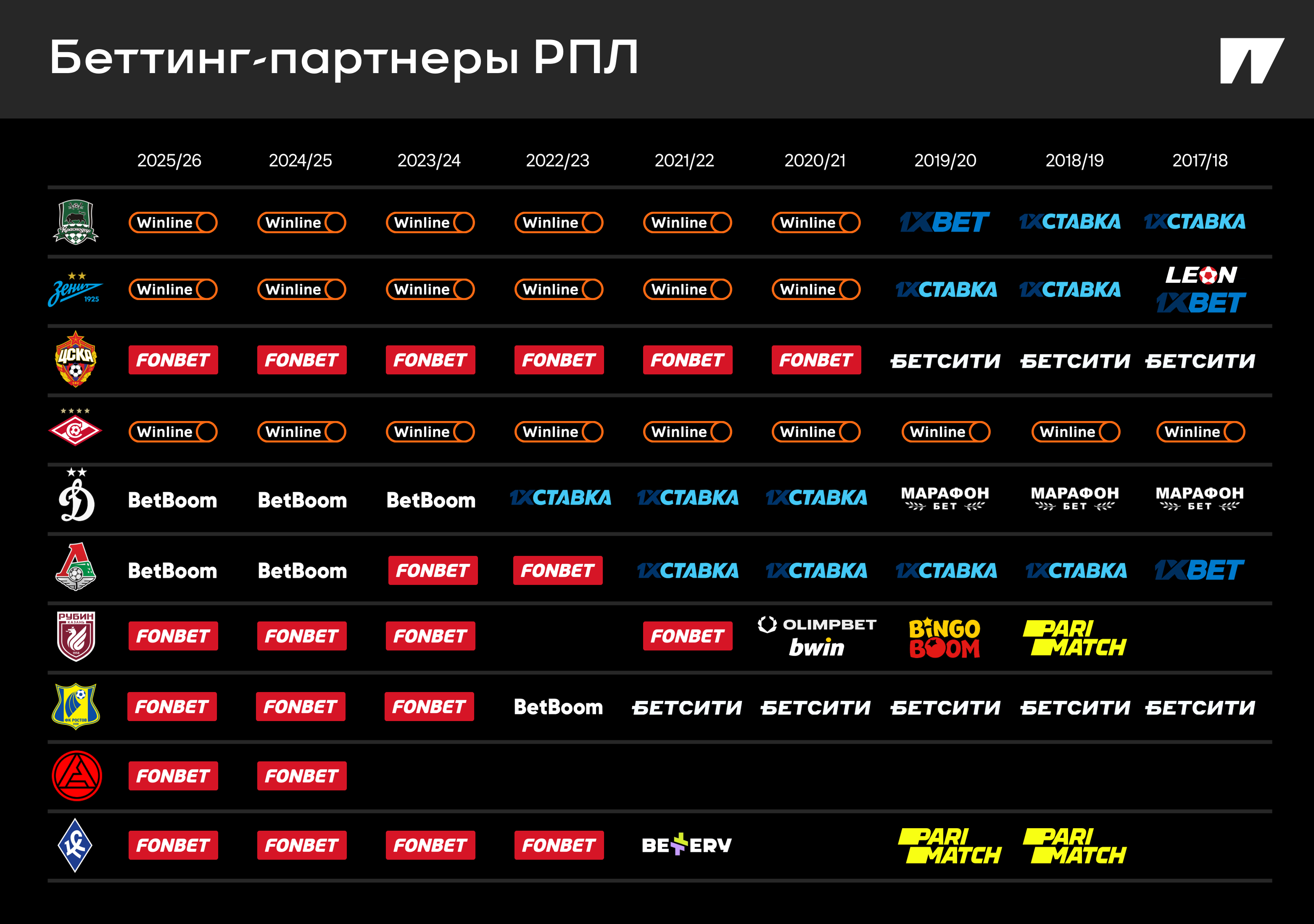 Беттинг-партнеры клубов РПЛ: Winline забрал топов, «Фонбет» берет количеством, аутсайдеры постоянно меняют БК