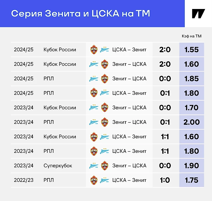 Афиша «Зенит» – ЦСКА не настраивает на оборонительный футбол, но именно в очном противостоянии у двух топ-клубов пока фиксируется тревожный тренд: 10 матчей во всех турнирах – строго тотал меньше, серия держится с 2022-го. Примечательно, что это еще и с учетом матчей в FONBET Кубке России, где тренеры используют ротацию.