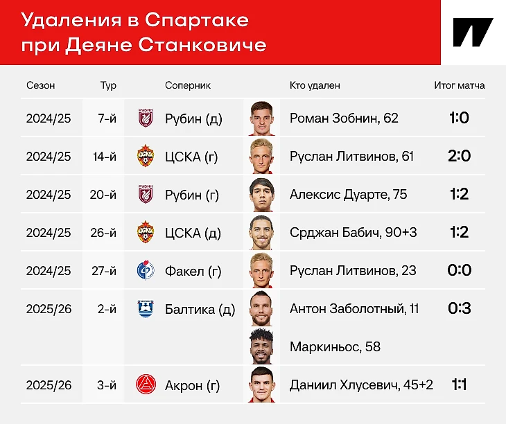Суммарно за 33 матча в МИР РПЛ это уже восьмая (!) красная карточка под руководством серба. То есть в среднем игроки «Спартака» удаляются примерно в каждой четвертой встрече. Абсолютное безумие по цифрам. Ранее во всех подробностях разобрали здесь.