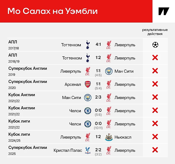 Боль Салаха на «Уэмбли»: 8 лет без голов, 0 ассистов за карьеру, забивал только один раз