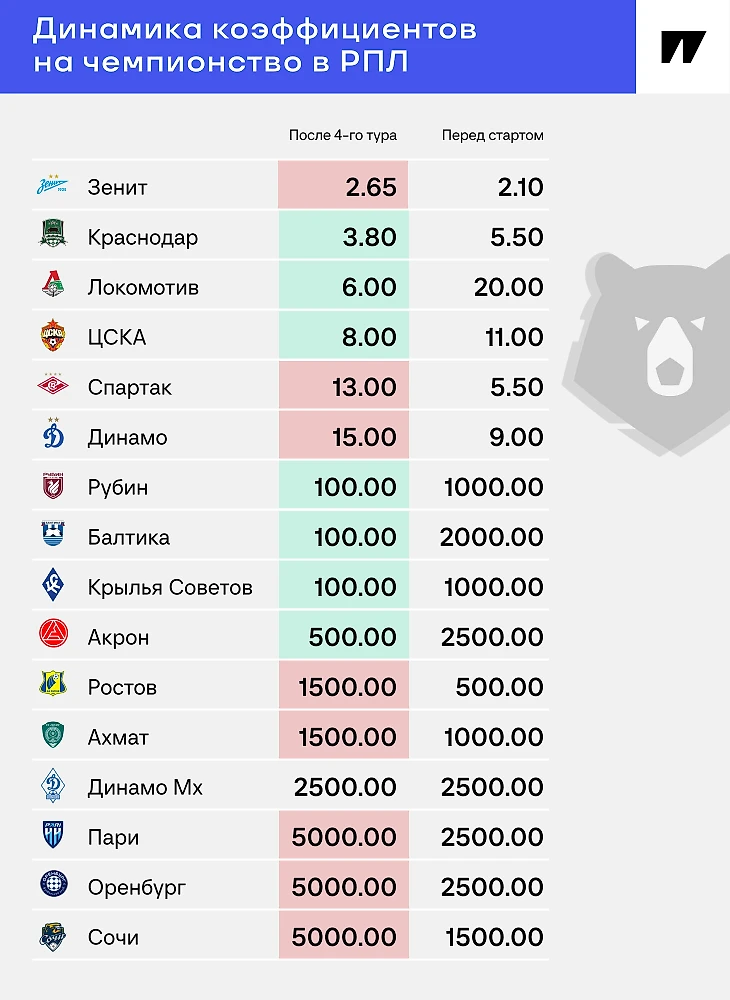 Логично, что расклады перевернулись после четвертого тура. «Зенит» – первый, но соседства со «Спартаком» больше нет. Теперь серьезнее относятся к «Локомотиву» и ЦСКА.
